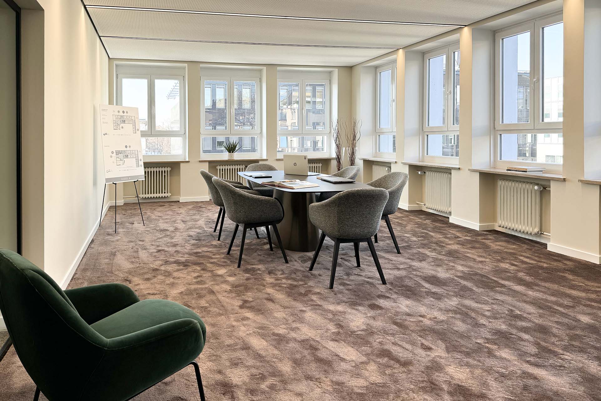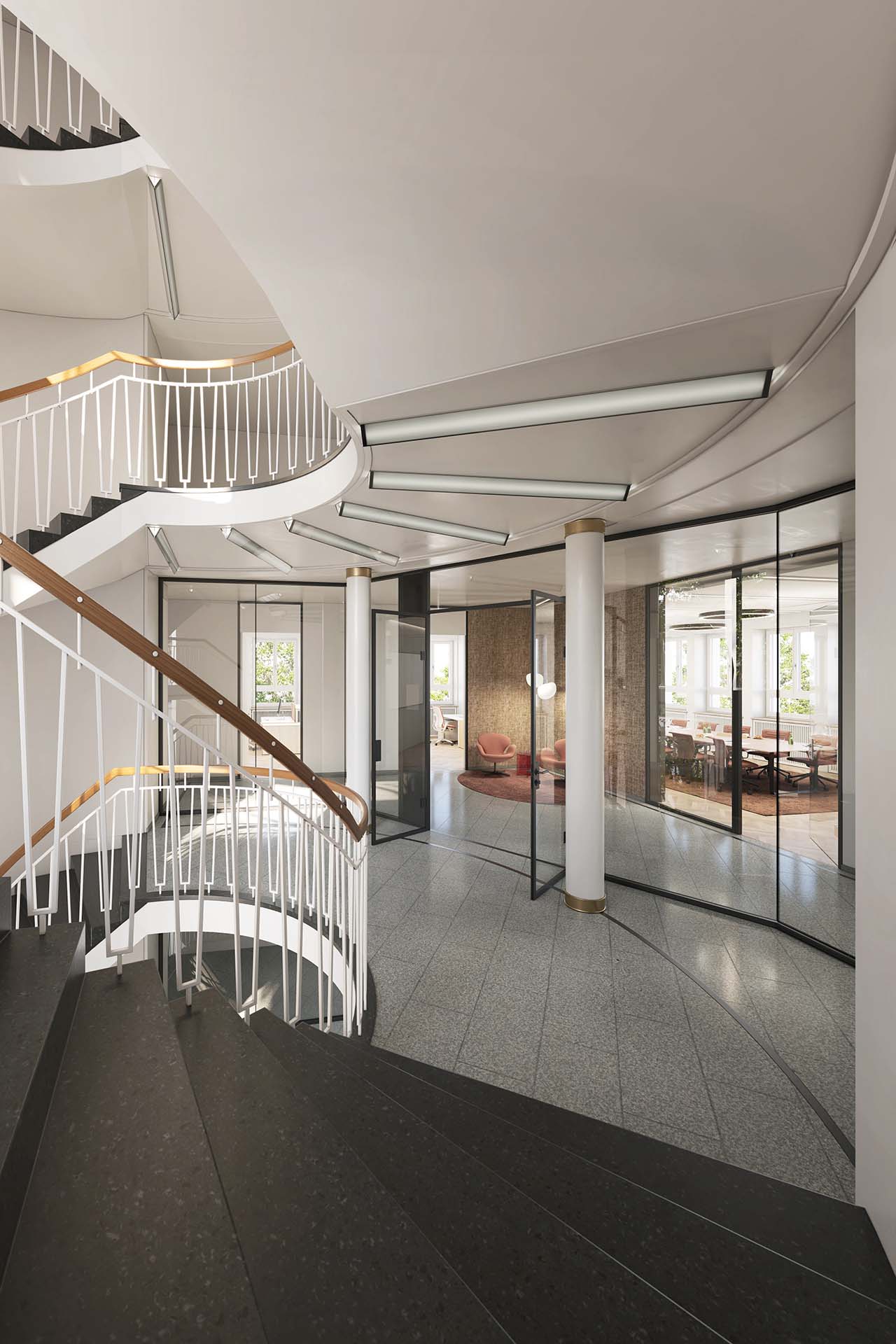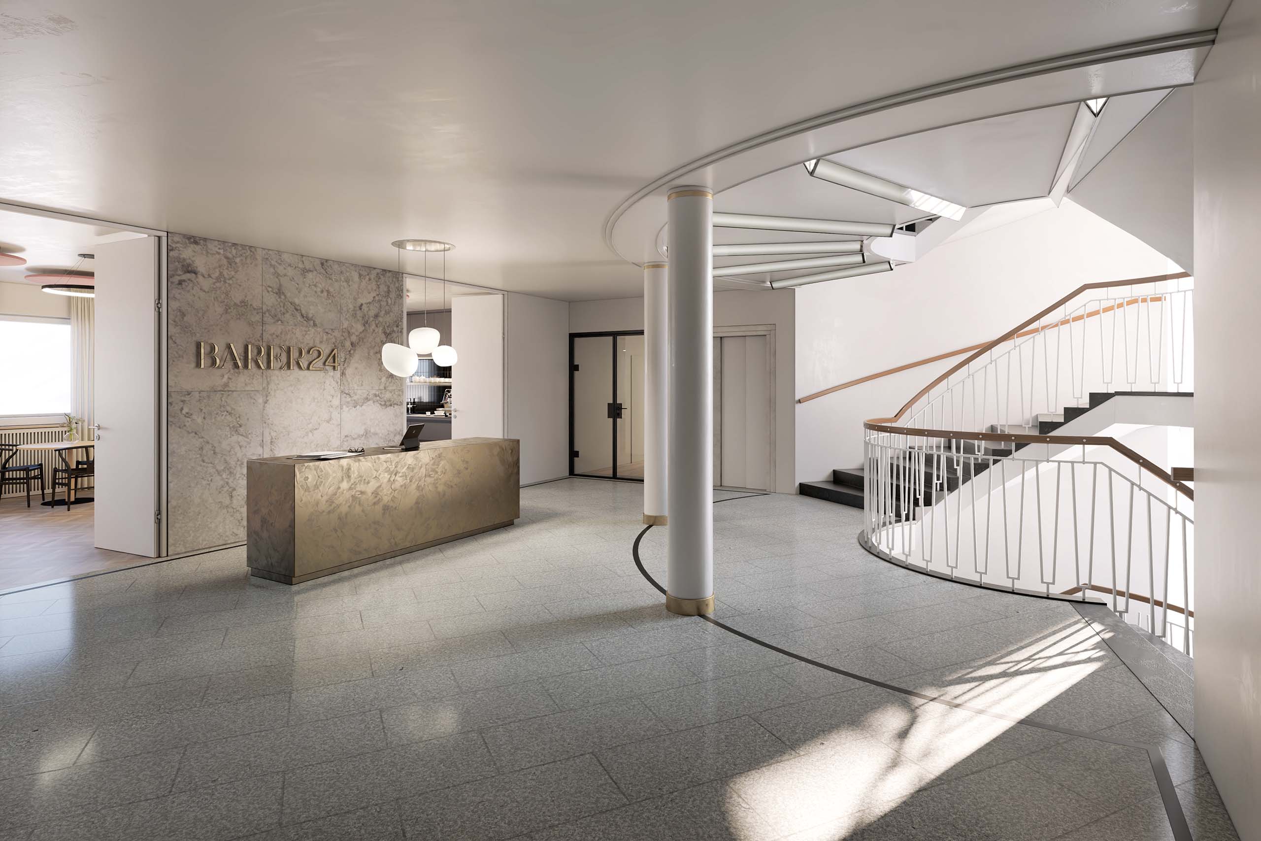 Die beeindruckende Beletage im 2. OG, das historische Treppenhaus, welches behutsam und hochwertig restauriert wird sowie die denkmalgeschützte Fassade machen die BARER24 zu einem besonderen und typischen Münchner Bau, welcher nun neuinterpretiert und mit modernen Elementen ergänzt wird.