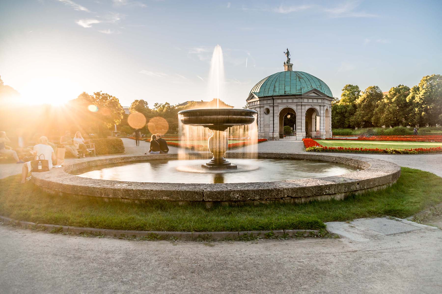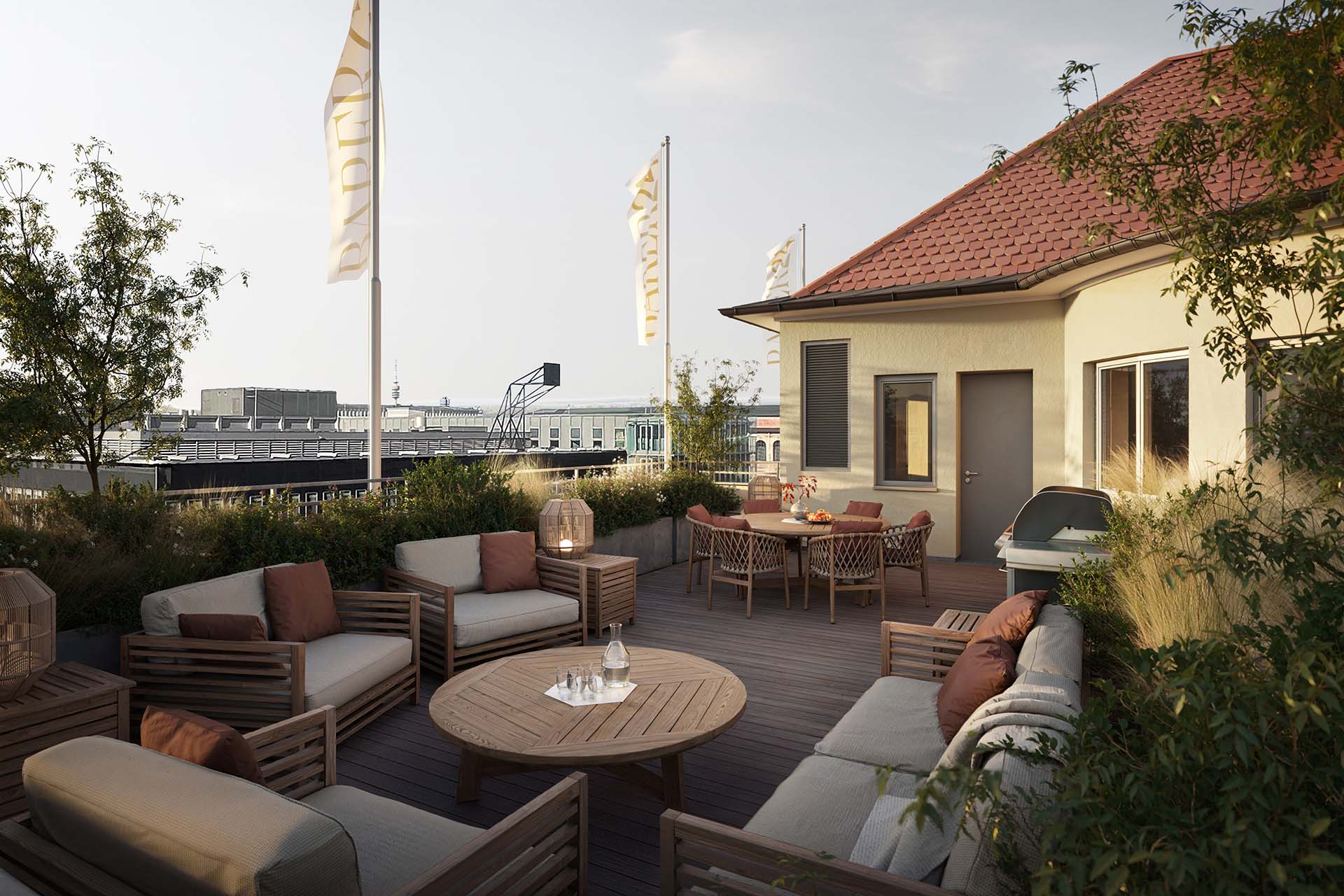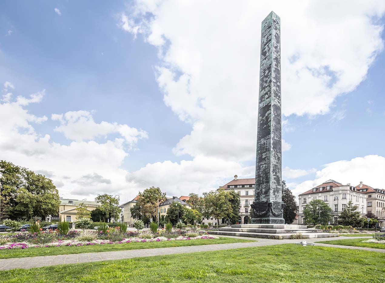 Mit seinem markanten schwarzen Obelisken ist der Karolinenplatz schon von weitem zu sehen. Liebevoll angelegt mit viel Grün und einer üppigen Blumenvielfalt eröffnet der Platz ein schönes Entrée zur Barer Straße. Das Flair der Nachbarschaft verbreitet eine Wohlfühlatmosphäre, die sich bis ins Gebäude zieht. Spätestens auf der hauseigenen Dachterrasse wird man Teil dieser besonderen Atmosphäre.